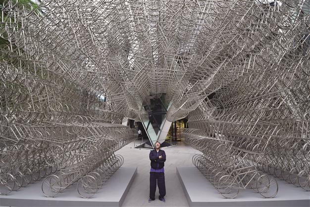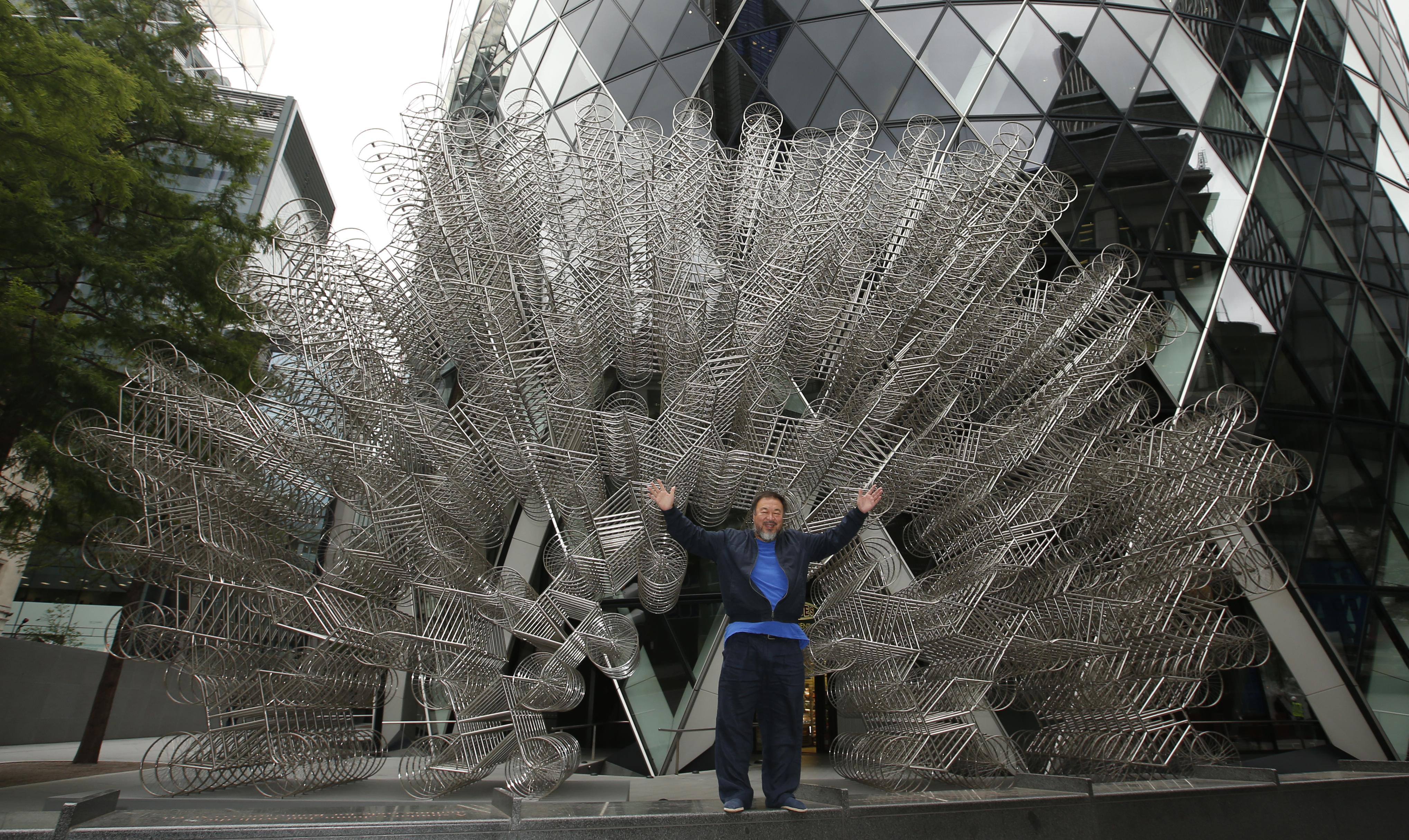 Chinese artist Ai Weiwei poses in front of his sculpture "Forever" at the base of the the "Gherkin" tower in the City of London on September 16, 2015, during a photocall to celebrate the completion of his installation, as part of the Sculpture in the City outdoor art exhibition. The nearly 10 metres tall and 16 metres wide structure consisting of 1,254 bicycle frames will be on display through May 2016. AFP PHOTO / LEON NEAL